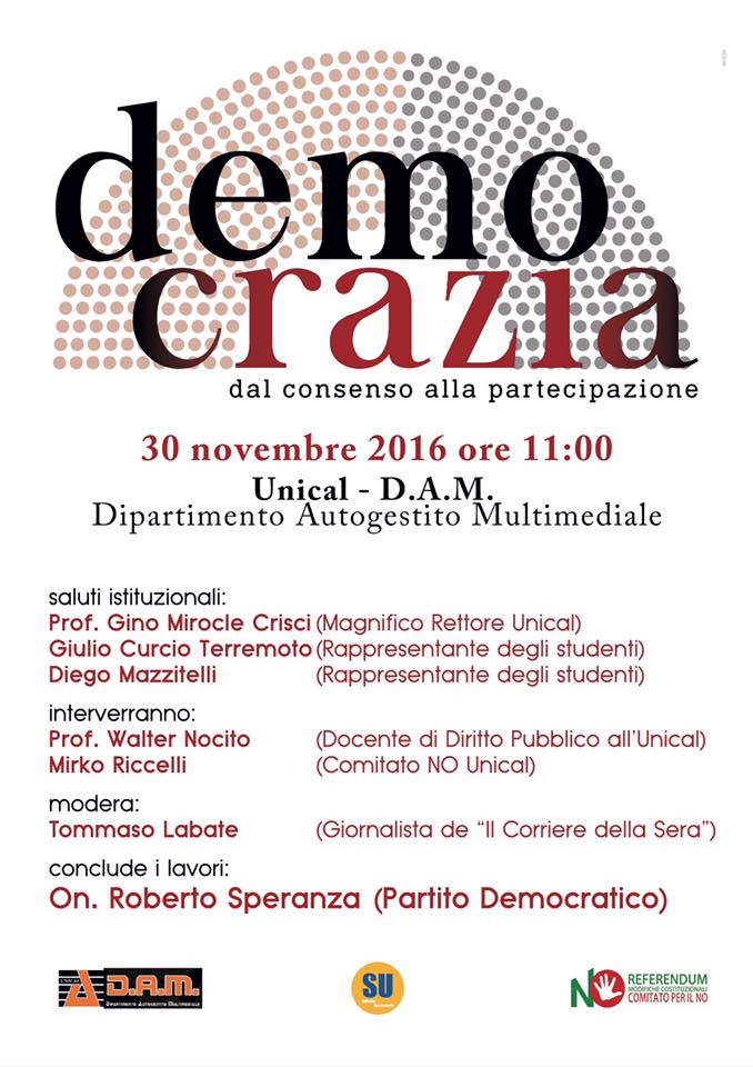Mercoledì 30 novembre alle ore 11.00 presso il DAM-Dipartimento Autogestito Multimediale (situato presso il Polifunzionale dell’Università della Calabria) in vista del prossimo referendum costituzionale si terrà un’iniziativa con l’On. Roberto Speranza dal titolo “Democrazia: dal consenso alla partecipazione”. L’appuntamento, organizzato dall’associazione Sviluppo Universitario in collaborazione con il Comitato UNICAL per il NO, è di quelli importanti, in quanto si illustrerà nel dettaglio la riforma costituzionale (che andrà a modificare circa un terzo dell’intero testo costituzionale) con i suoi pro e contro sotto ogni punto di vista, quindi, non solo in ambito politico, ma soprattutto sotto il profilo tecnico-giuridico. Il referendum del 4 dicembre è ormai vicinissimo e questo potrebbe essere uno degli ultimi incontri all’UNICAL prima del voto.