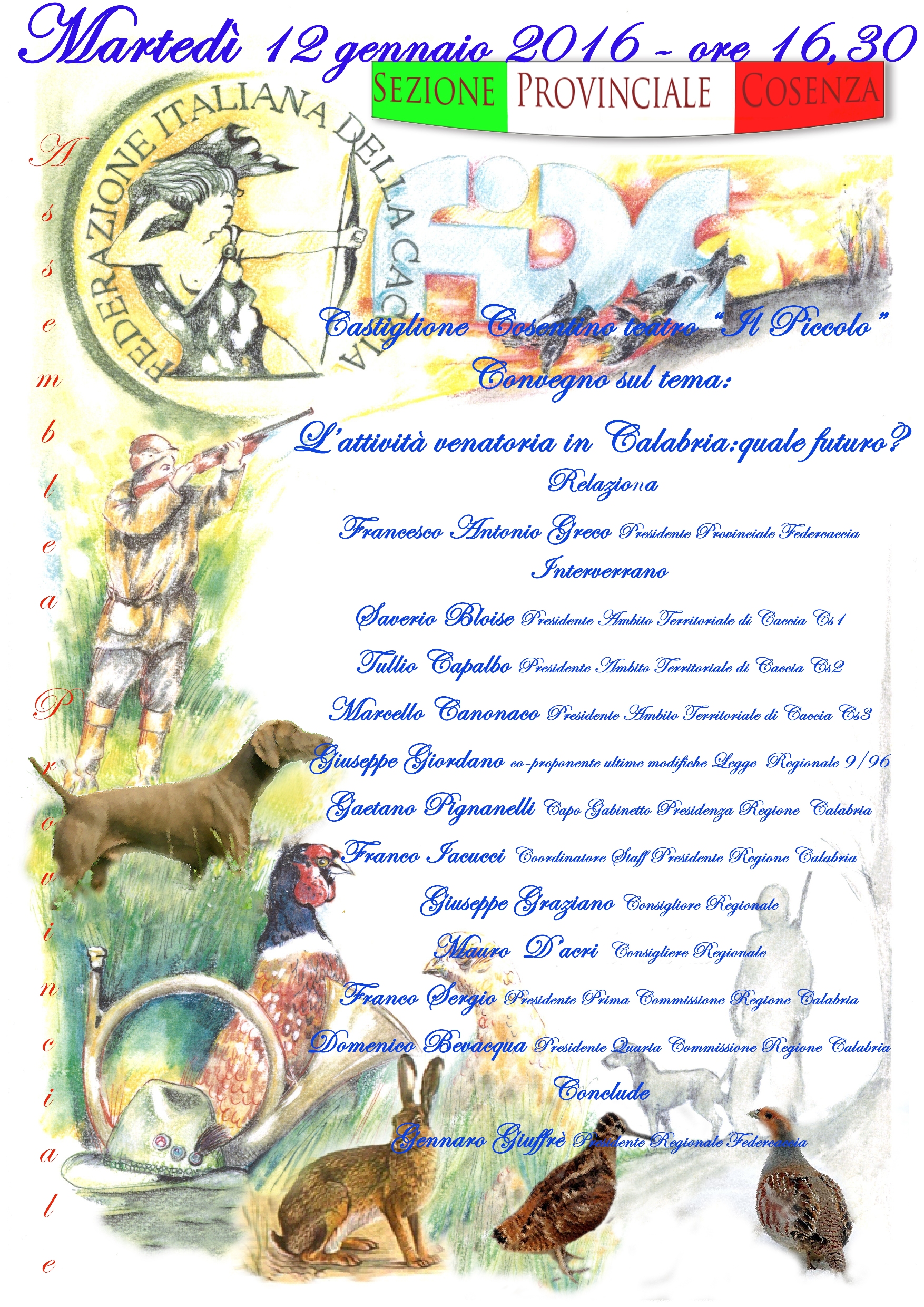 Il dibattito sarà ospitato a Castiglione Cosentino, martedì prossimo, 12 gennaio 2016, alle ore 16.00, presso il Piccolo Teatro. Concluderà la manifestazione Gennaro Giuffrè, presidente Regionale Federcaccia.