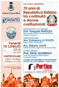 A partire da questi presupposti, e non solo, il 15 luglio, alle ore 18.00, i 70anni della nostra Repubblica (1946-2016) saranno al centro di un incontro – dibattito nella sala consiliare del palazzo di Città, grazie all’Associazione Kontattoproduction con il patrocinio del Comune e la collaborazione dell’Ordine degli Avvocati.