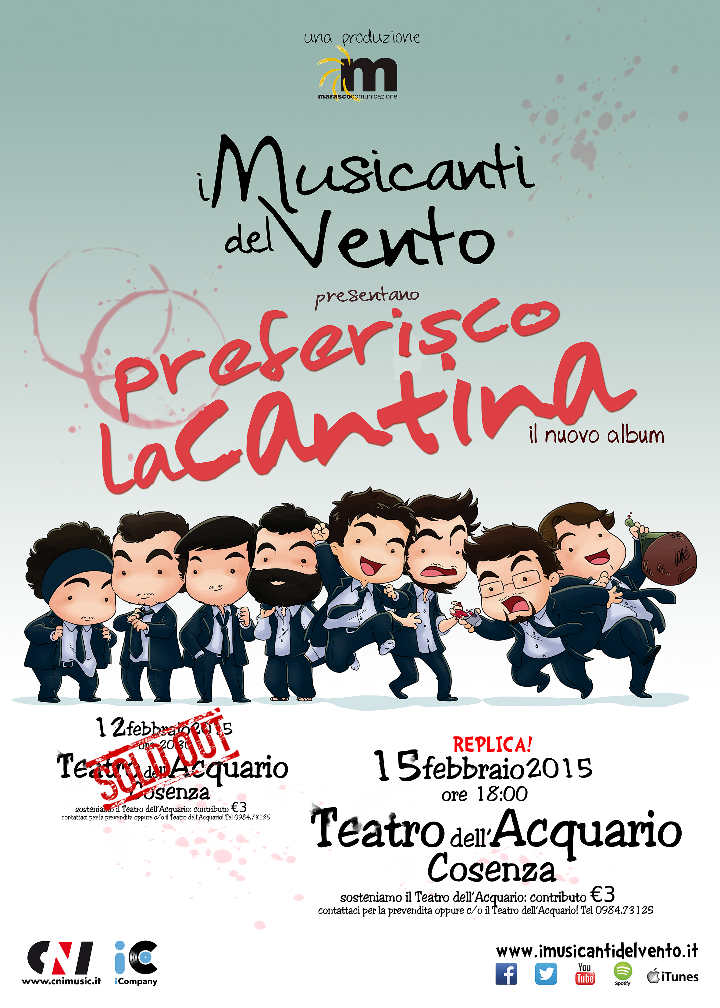 Contagiati dalla musica dei “I MUSICANTI DEL VENTO” con il loro ultimo lavoro “PREFERISCO LA CANTINA” giriamo i teatri di Calabria alla scoperta di questo gruppo decisamente sui generis. E’ la volta del Teatro dell’Acquario a Cosenza il 12 Febbraio alle 20,30. Soldout per questi ragazzi che destano tanta curiosità e si replica il 15 alle ore 18. Certo che assistere ad una loro esibizione ti accende quella valvola di energia che solo un bel bicchiere di vino ti sa dare, il loro concerto non è solo musica ma un’esperienza teatrale, una bevuta in compagnia, un abbraccio di un amico. I Musicanti del Vento suonano musica e raccontano storie La Marasco Comunicazione ci tiene a sottolineare come il successo che stanno ottenendo conduce ad un pubblico nazionale, siamo pronti a sugellare questa esplosione di musica con grandi occasioni nel panorama della musica, questi ragazzi ci invitano a parlare, a comunicare, ci invitano ad ascoltarci e lo fanno a 360 gradi coinvolgendo tutti. E’ l’inizio di una bella avventura.