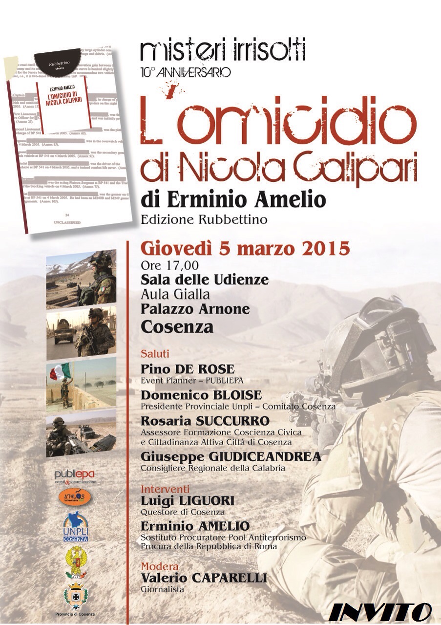 Di questa tragica vicenda di cronaca, della commemorazione dell’uomo e del professionista Calipari, dei fatti politici susseguiti alla sua morte, al contesto socio-politico della guerra che si vive ancora in quei luoghi, di terrorismo internazionale e delle evoluzioni che questo fenomeno ha sviluppato sino ai giorni nostri con la propaganda mediatica dell’ISIS, si parlerà domani, giovedì 5 marzo 2015, in un doppio incontro con l’autore del libro e con alcune autorità istituzionali locali.