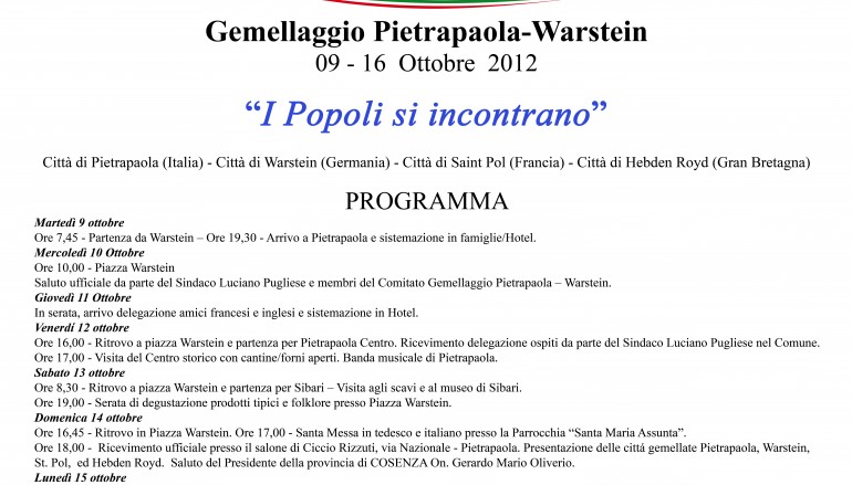 Un’importante iniziativa di carattere socio culturale è prevista a Piatrapaola dal 9 al 16 ottobre prossimi. La cittadina ionica ospiterà una rappresentanza della Città di Warstein (Germania), con cui è ufficialmente gemellata.