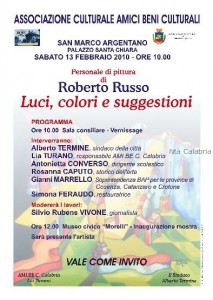 Sabato 13 febbraio prossimo, alle ore 10.00, a San Marco Argentano (Cosenza), nel palazzo santa Chiara, sarà presentata una personale di pittura di Roberto Russo dal titolo LUCI, COLORI E SUGGESTIONI.