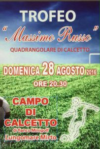 Al via la 21esima edizione del Memorial-Trofeo di calcio in memoria di Massimo Russo. Le vecchie glorie del calcio mirto-crosiota e del territorio della Sibaritide e della Valle del Trionto si sfideranno in un quadrangolare di calcio a 5 che si terrà la prossima domenica 28 Agosto 2016, a partire dalle Ore 20.30, presso la struttura sportiva comunale del lungomare Centofontane, nei pressi del bar Cursal-Minigolf.