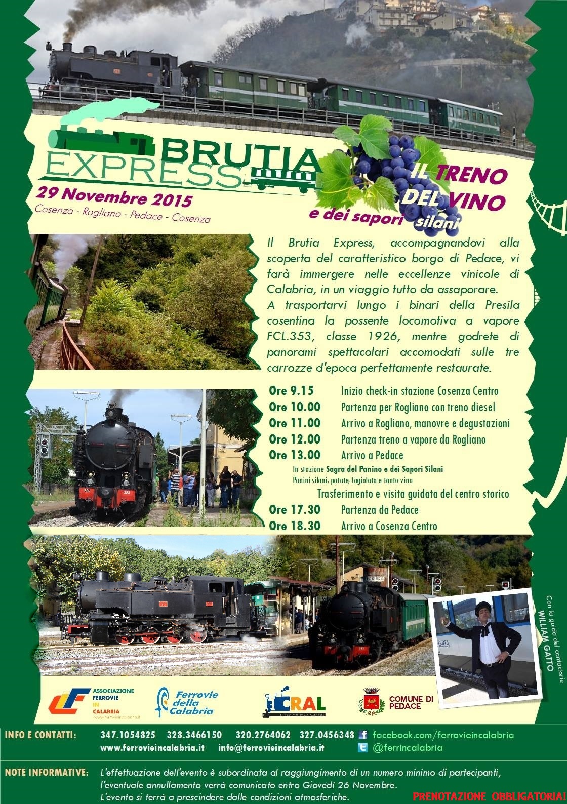 L’iniziativa “Brutia Express – Treno del Vino e dei Sapori Silani”, tenutasi giorno 8 novembre tra Cosenza, Rogliano e Pedace ha riscosso successo. La locomotiva FCL 353 è tornata a sbuffare in un’atmosfera tipicamente autunnale, ma climaticamente consona all’Estate di San Martino.