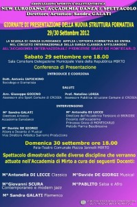 Per domenica 30 settembre, alle ore 18, presso il pala-teatro comunale, in Piazza Jannelli (dietro scuola primaria Via dell’Arte) a Mirto, è previsto, invece, uno spettacolo dimostrativo delle diverse discipline che verranno attuate nell’Accademia di Mirto, a cura dei seguenti docenti: Antonella Di Lecce (Classico),