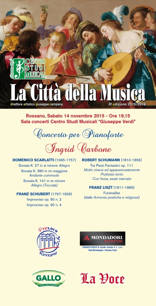 Al Centro Studi Musicale “G. Verdi” saranno presentati concerti di altissimo livello qualitativo, con musicisti professionisti e gruppi di levatura internazionale. Al concerto fissato per sabato 14 novembre alle ore 19.15, presso la sala concerti del Centro Studi “G.Verdi”, s esibirà la pianista Ingrid Carbone.