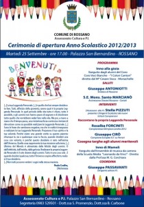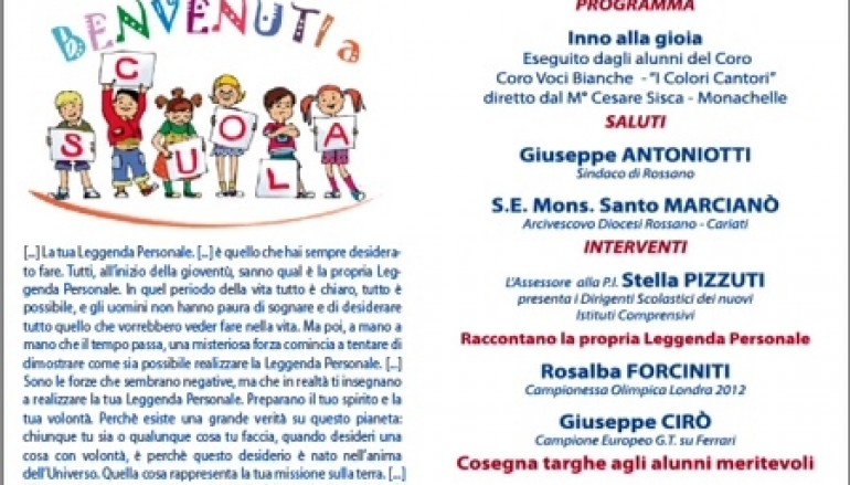 È molto importante – dichiara l’assessore PIZZUTI – che l’inizio di questo nuovo anno scolastico venga considerato come un appuntamento gioioso, durante il quale tutte le componenti della scuola si incontrano per premiare gli alunni più meritevoli, che hanno tenuto alto il nome di Rossano in competizioni scolastiche a livello provinciale, regionale e nazionale. Credo che le gratificazioni – continua – siano indispensabili per i ragazzi in quanto forniscono loro uno stimolo a fare sempre meglio ed a scoprire e coltivare i propri talenti. Bisogna perseguire i propri sogni – conclude l’assessore – perché, come scrive Paulo Coelho nel brano tratto da “L’Alchimista”, citato anche sulla locandina di presentazione, “Realizzare la propria leggenda personale è il solo dovere degli uomini”.