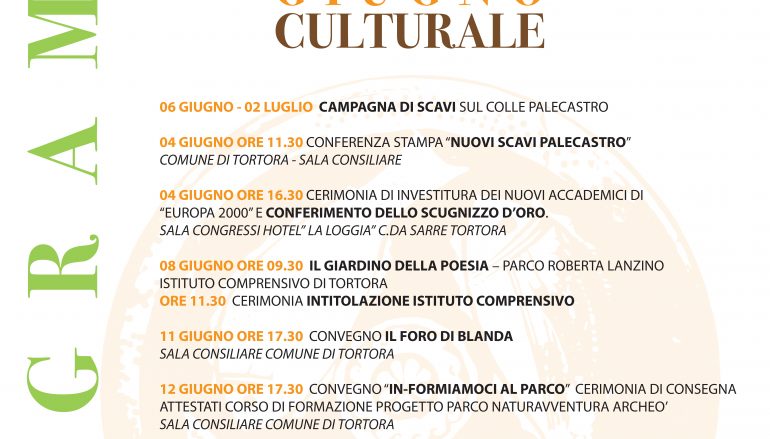 Tante iniziative presenti nel cartellone di eventi di “Giugno Culturale”, organizzato dall’Assessorato alla Cultura del Comune di Tortora. Nella mattinata di sabato, 4 giugno, si terrà la conferenza stampa “Nuovi scavi sul Palecastro”. Nel pomeriggio dello stesso giorno, alle ore 16,30, presso un Hotel di Tortora, si svolgerà la cerimonia d’investitura dei nuovi accademici di “Europa 2000” e il conferimento dello Scugnizzo d’Oro. La campagna di scavi sul colle Palecastro avrà inizio il 6 giugno e terminerà il 2 luglio.