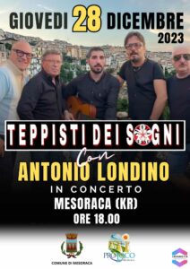 Ebbene, per chiunque volesse concedersi la gioia di assaporare momenti di magia in questo clima di festa e di amore, giovedì, 28 dicembre, alle ore 18, a Mesoraca (KR), i Teppisti dei sogni si esibiranno in concerto con Antonio Londino. L’evento è stato organizzato dal Comune di Mesoraca insieme con la Proloco, istruzioni che in questi ultimi tempi stanno dando un segnale fortissimo circa l’importanza della cultura locale. Sarà senza alcun dubbio una serata indimenticabile, colma di emozioni e che certamente ci fornirà la carica giusta per seguire vivendo con armonia le nostre giornate.
