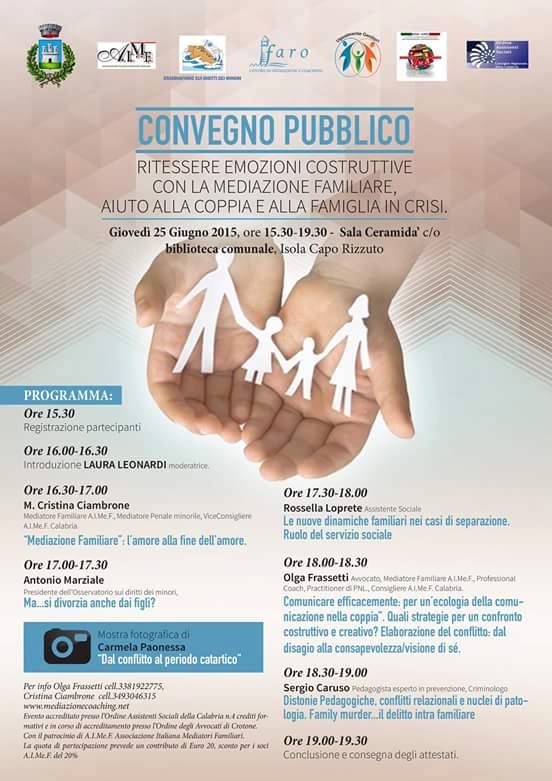 Si terrà Giovedì 25 Giugno, presso la Sala Ceramidà di Isola Capo Rizzuto, il convegno pubblico sulla mediazione familiare, dal titolo: “Ritessere emozioni costruttive, con la mediazione familiare, aiuto alla coppia e alla famiglia in crisi”.