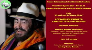 Venerdì 19 Agosto 2016, alle ore 21.00, nello spazio del Chiostro della Chiesa di San Giorgio al Corso, il Centro Internazionale Scrittori della Calabria, nel contesto del ciclo di incontri con le “Grandi voci del Teatro Lirico”, promuove il sesto incontro“Luciano Pavarotti: i miracoli di una grande voce”.