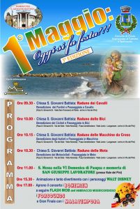 Alle ore 9.30 raduno dei cavalli davanti alla Chiesa San Giovanni Battista, dove, alla benedizione dei fantini, seguirà l’avvio della passeggiata a cavallo che seguirà il percorso di Piazza San Giovanni Battista e Viale San Francesco di Paola, giungendo poi in Via dei Pini. Alle ore 10.00 nello stesso luogo si terrà il raduno delle bici, con benedizione dei ciclisti e avvio della passeggiata in bicicletta. Alle ore 10.15, si terrà il raduno delle macchine da cross con benedizione degli autisti e inizio della passeggiata. Alle ore 10.30, infine, raduno delle moto, benedizione dei motociclisti e inizio della passeggiata in moto. Il percorso di queste tre escursioni prenderà il via dal piazzale della Chiesa, si snoderà poi su Via del Sole, Viale Kennedy, Piazza Centofontane, Viale Jonio, Lungomare fino ad arrivare in Via dei Pini, dove è in programma la Santa Messa in onore a San Giuseppe lavoratore.