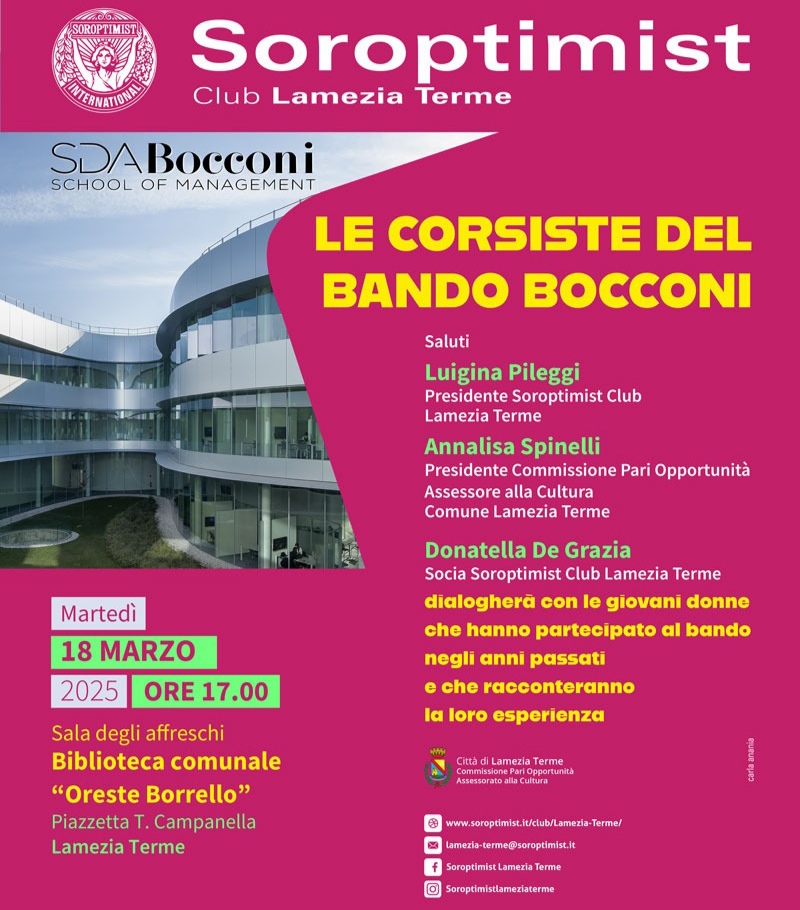 Il Soroptimist Club di Lamezia Terme, ha organizzato l’evento “Le corsiste del Bando Bocconi”, che si terrà martedì 18 marzo 2025 alle ore 17.00 nella Sala degli affreschi della Biblioteca comunale “Oreste Borrello” a Lamezia Terme.