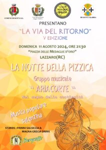 L’11 agosto, invece, sarà dedicato alla Pizzica salentina con il gruppo musicale “AriaCorte”. Questo noto gruppo etno-popolare salentino, composto da affermati musicisti nazionali, porterà a Lazzaro i ritmi coinvolgenti della tradizione salentina.