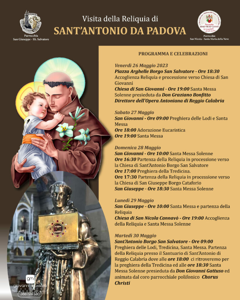 Visita della reliquia di Sant’Antonio da Padova. Oggi, Venerdí 26 Maggio, presso la Piazza Arghelle Borgo San Salvatore a Reggio Calabria i fedeli accoglieranno la Reliquia di Sant’Antonio. Di seguito il programma dell’evento che prevederá vari appuntamenti fino a Martedí 30 Maggio.