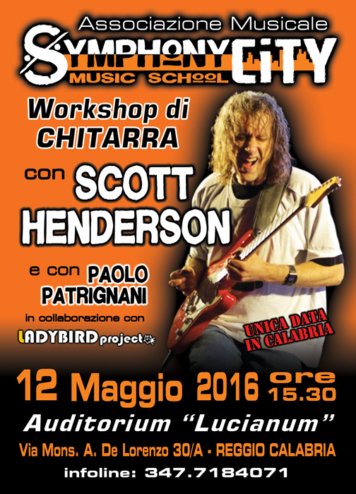 Scott Henderson arriva a Reggio Calabria. Il noto chitarrista statunitense sarà protagonista il prossimo giovedì 12 maggio, a partire dalle ore 15.30 presso l’auditorium “Lucianum”, dell’ultimo appuntamento inserito nel ciclo di workshop organizzato dalla SymphonyCity Music School, diretta da Gianni Polimeni. L’artista, originario del sud della Florida, si esibirà nell’unica data programmata in Calabria. Si tratta di un’occasione molto particolare, perché gli studenti potranno approfondire gli studi di chitarra interagendo con Scott Henderson che spiegherà alcuni passaggi della sua performance. Nel contempo, i tanti appassionati e fan avranno l’opportunità di godersi un vero e proprio show dal vivo di uno dei più grandi chitarristi al mondo. L’evento, realizzato in collaborazione con Paolo Patrignani e Ladybird project, chiude il ciclo di appuntamenti della SymphonyCity music school per la stagione 2015-2016: prima di lui sul palco del “Lucianum” sono saliti artisti del calibro di Mike Stern e Cristiano Micalizzi.