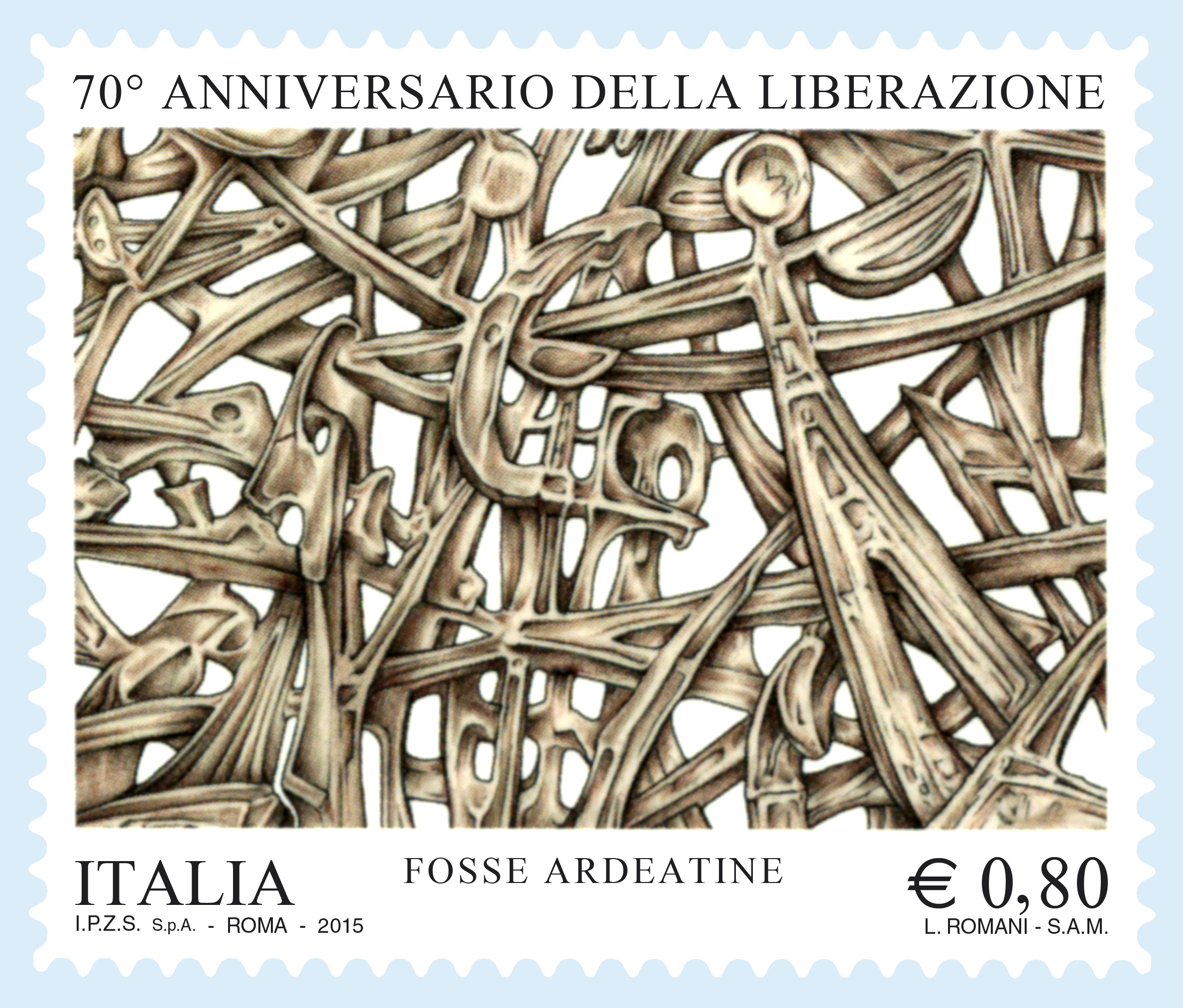 La vignetta, realizzata dal bozzettista Luca Romani della Scuola dell’Arte della Medaglia dell’Istituto Poligrafico e Zecca dello Stato S.p.A., riproduce un particolare del solenne cancello d’ingresso del Sacrario delle Fosse Ardeatine, opera in bronzo dello scultore Mirko Basaldella che rappresenta figurativamente l’orrore umano del crudele massacro perpetrato dalle forze di occupazione tedesche a Roma, il 24 marzo 1944, nelle cave di via Ardeatina.