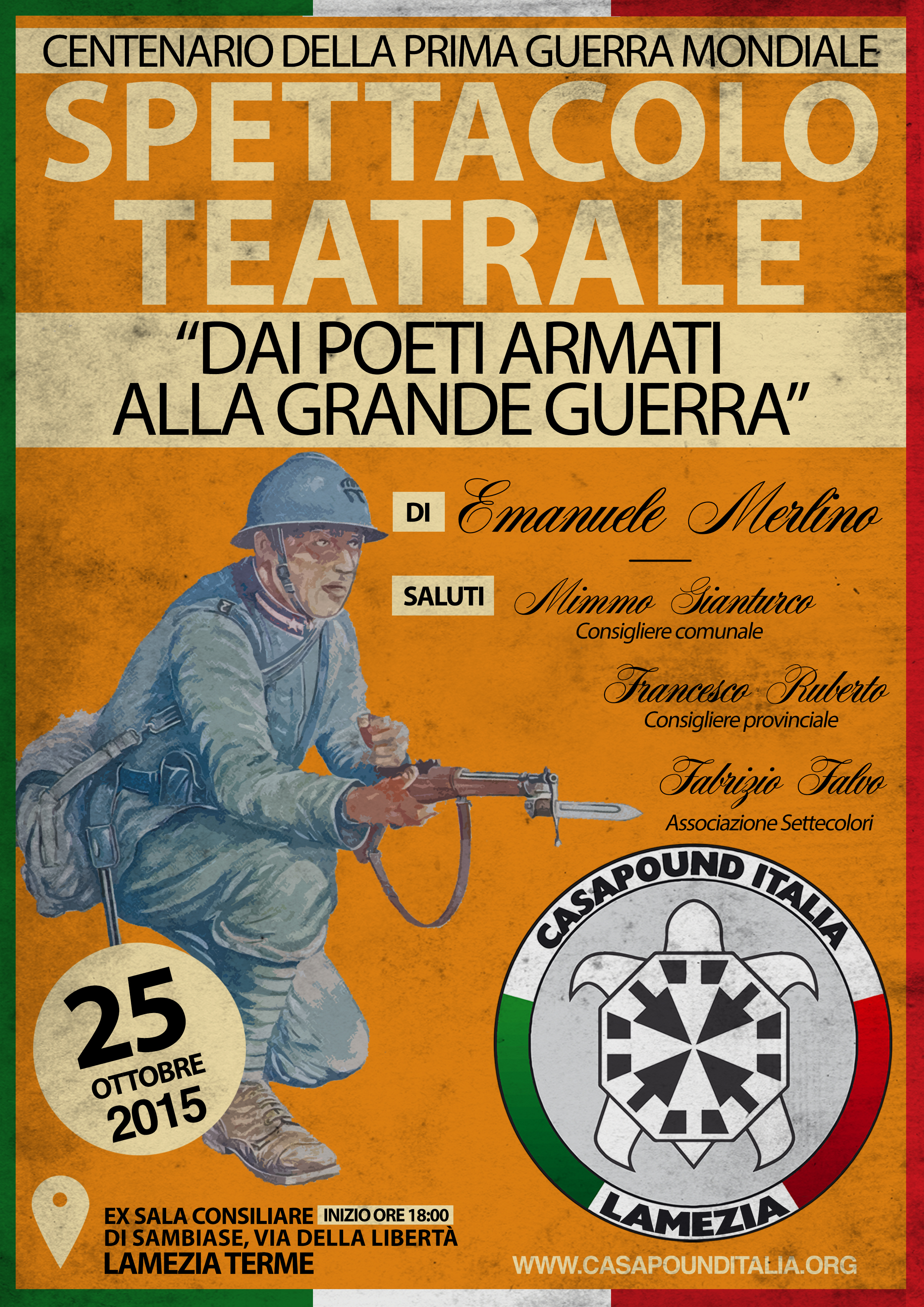 Sabato 24 ottobre presso l’ex sala consiliare di Sambiase, a Lamezia Terme, andrà in scena lo spettacolo riguardante la Prima Guerra Mondiale, “Dai poeti armati alla grande guerra“. L’evento organizzato dalla sezione lametina di CasaPound Italia inizierà alle ore 18:00.