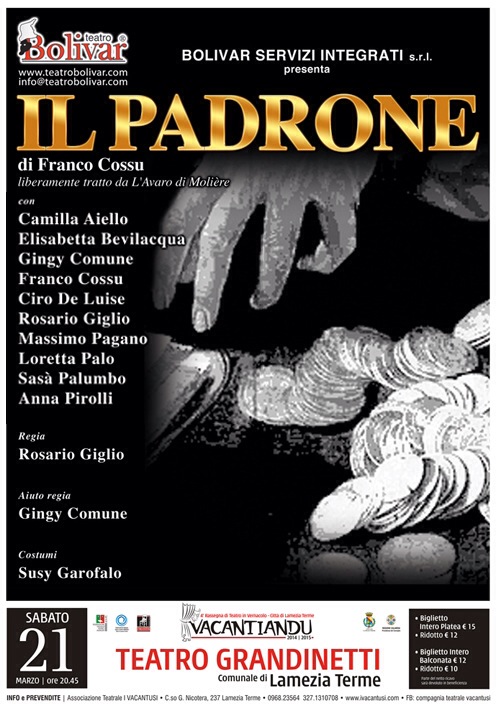 “IL padrone” è una commedia in prosa dalle mille sfaccettature, divertente, amara, riflessiva, una messa in scena “insolita”, una regia curata nei minimi particolari senza tralasciare la parte del testo antica e nel contempo vicinissima ai giorni d’oggi. Un classico intramontabile. Arpagone, il vecchio protagonista, è a dir poco odiato dai suoi figli, Cleante ed Elisa. Cleante lo odia perchè Arpagone vuole sposare la giovane e povera Mariana che lui segretamente ama; Elisa, invece, lo detesta perchè vuole darla in sposa all’anziano signor Anselmo che è disposto a prenderla senza dote. Cleante fa rubare dal suo servo la cassetta dove lo stizzoso Arpagone tiene tutti i suoi averi pensando di usarla come merce di scambio con il padre per avere Mariana. Ma il padre accusa di furto il suo intendente Valerio, che da tempo ha imbastito una storia d’amore con Elisa. Tutto s’aggiusta con l’arrivo del ricco Anselmo che, invece di chiedere ufficialmente la mano ad Elisa, riconosce nella bella Mariana e nell’intendente Valerio i suoi figli, che credeva da tempo morti in un naufragio. Convolate a giuste nozze le due coppie di innamorati, Arpagone ritroverà il suo tanto bramato ed adorato tesoro.