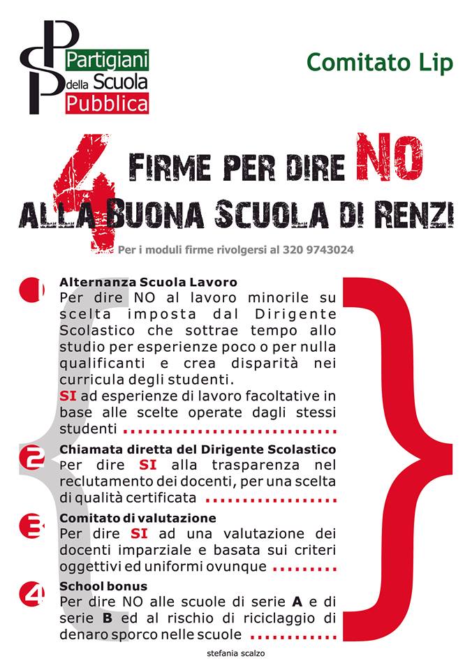 Una riforma che legittima gli abusi di potere dei dirigenti nel reclutamento clientelare e arbitrario degli insegnanti, cancella le graduatorie dei punteggi dei docenti, garanzia di trasparenza e legalità, sfrutta gli studenti liceali con l’alternanza scuola-lavoro obbligatoria al mattino, quindi in orari in cui invece si dovrebbe studiare e favorisce la privatizzazione della Scuola di stato.