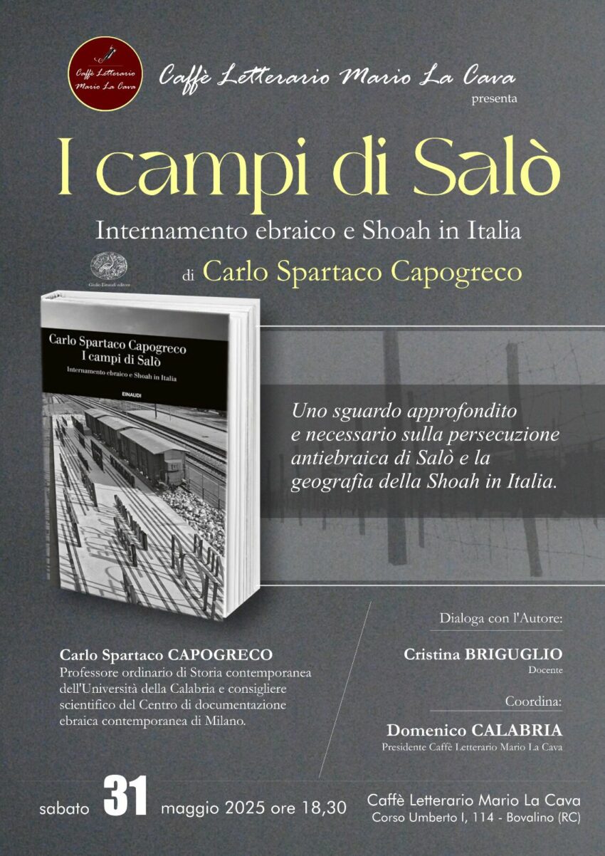 Sabato 31 maggio 2025 alle ore 18:30, presso il Caffè Letterario “Mario La Cava” di Bovalino (RC), si terrà un incontro di grande rilievo culturale e storico: la presentazione del libro “I campi di Salò. Internamento ebraico e Shoah in Italia” di Carlo Spartaco Capogreco, edito da Einaudi.