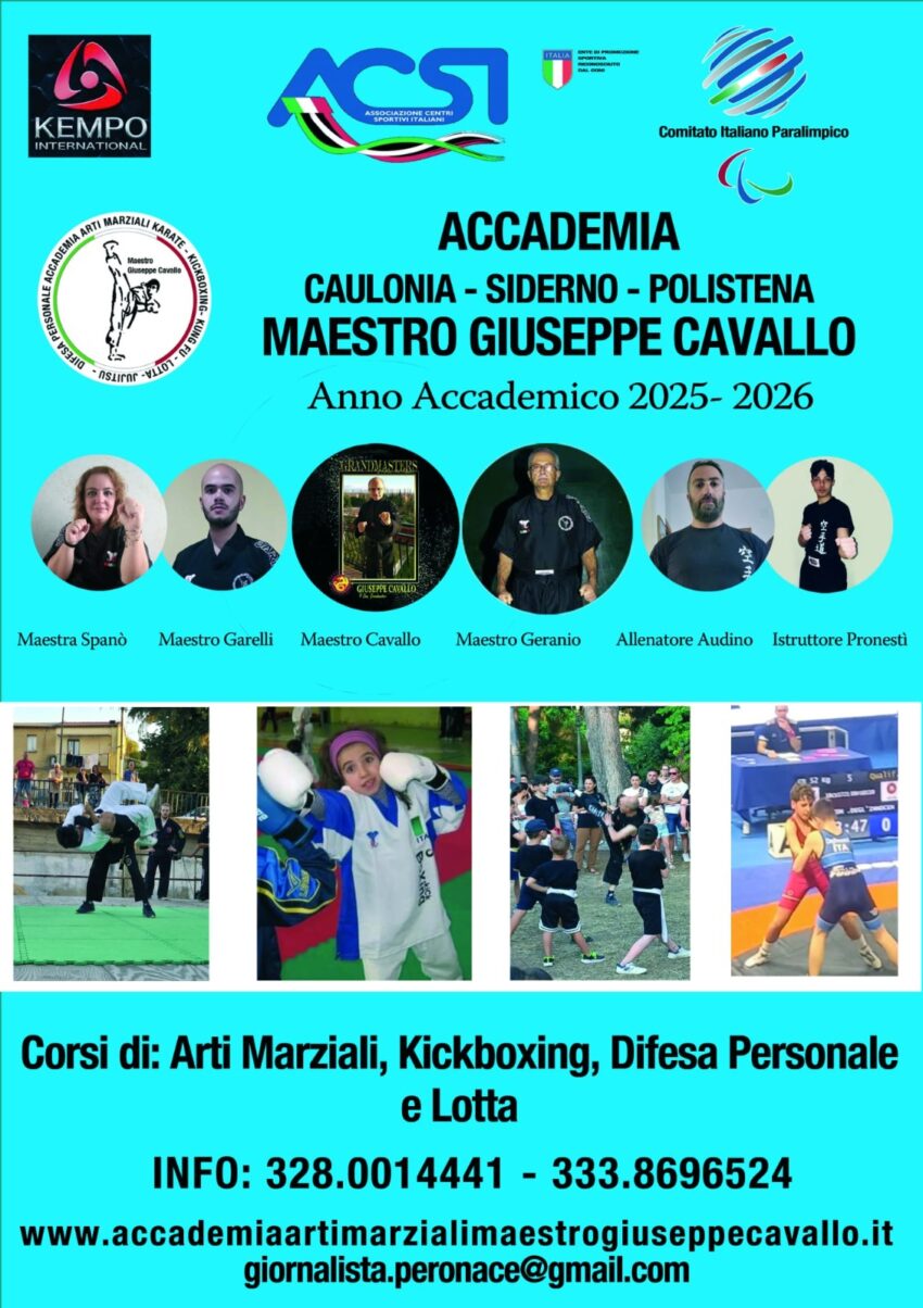 Al via i corsi di arti marziali, difesa personale e kickboxing, presso l’Accademia fondata e diretta dal Maestro Giuseppe Cavallo, direttore tecnico internazionale, responsabile per l’Europa del Sud e Africa di Kempo International e insegnante tecnico qualificato delle maggiori federazioni CONI. Un Maestro di Arti Marziali, che è un punto di riferimento sul tatami ma anche fuori dalla palestra, soprattutto per gli atleti che hanno deciso di intraprendere un percorso basato sulla disciplina, l’impegno e il rispetto. Le attività dell’Accademia, pluricampione nazionale e internazionale, che detiene, da anni, anche il record del maggior numero di atleti convocati in nazionale, si svolgono presso: la palestra di Siderno, in via dei Tigli, nei pressi del negozio La Bicicletta;