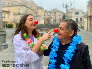 “La fotografia, scattata dalle alunne in un suggestivo scorcio all’aperto, ritrae una giovane volontaria che interagisce premurosamente con un anziano. I due protagonisti, che indossano il naso rosso da clown, si scambiano sorrisi dolci e pieni di significato. Questo scatto cattura un momento di connessione umana, trasmettendo calore e affetto. La volontaria stringe con forza la mano dell’anziano, promettendo vicinanza e conforto. Questo momento di intimità e solidarietà riflette la bellezza e la potenza del volontariato sociale, evidenziando il valore delle connessioni tra generazioni.