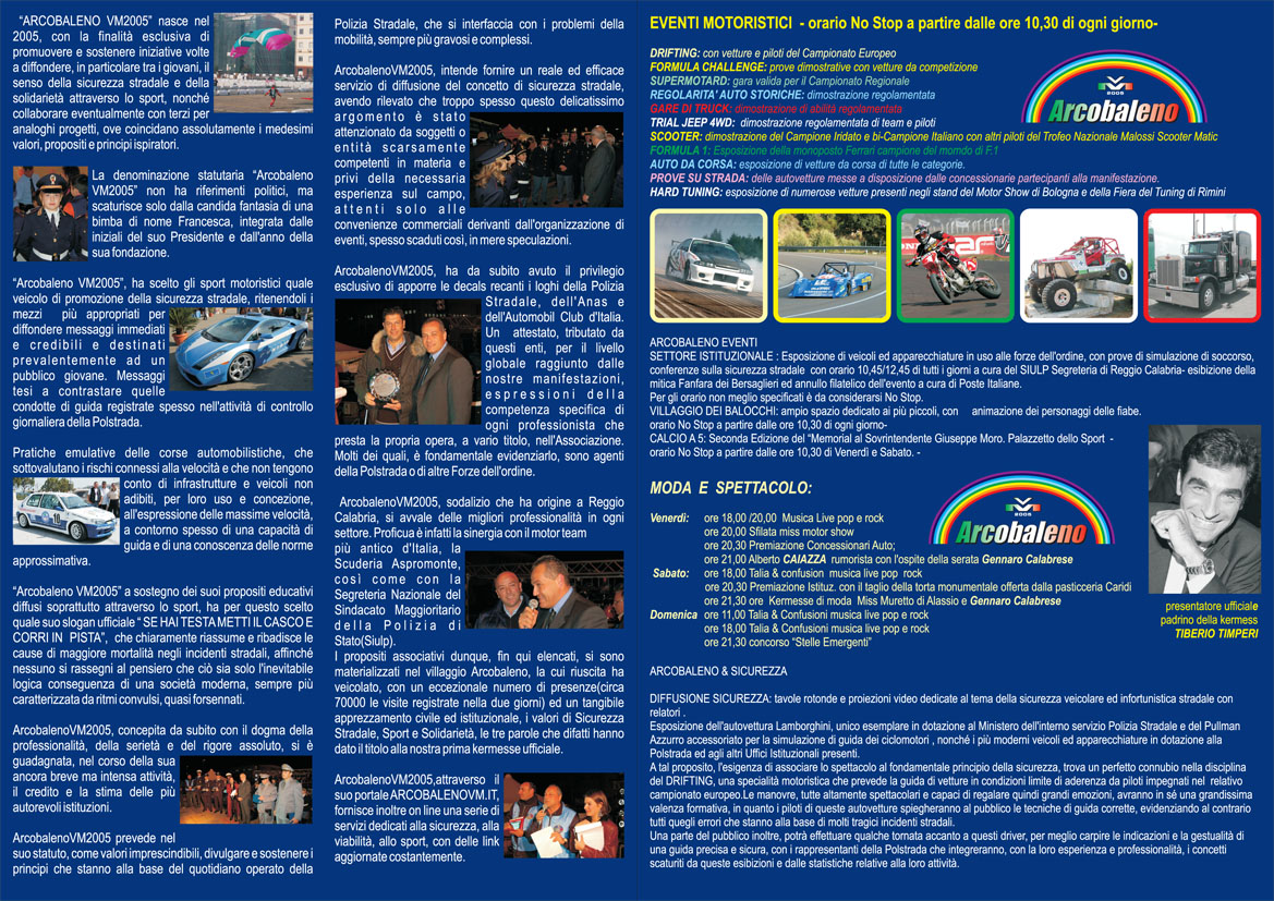 • “Arcobaleno VM2005”, ha scelto gli sport motoristici quale veicolo di promozione della sicurezza stradale, ritenendoli i mezzi più appropriati per diffondere messaggi immediati e credibili e destinati prevalentemente ad un pubblico giovane. Messaggi tesi a contrastare quelle condotte di guida registrate spesso nell’attività di controllo giornaliera della Polstrada.