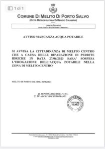 L’Ufficio Tecnico del comune di Melito di Porto Salvo, avvisa la cittadinanza che in data 27.06.2023 nella parte centrale della cittadina sarà sospesa l’erogazione dell’acqua potabile a causa di alcune riparazioni di perdite idriche sulla condotta principale.