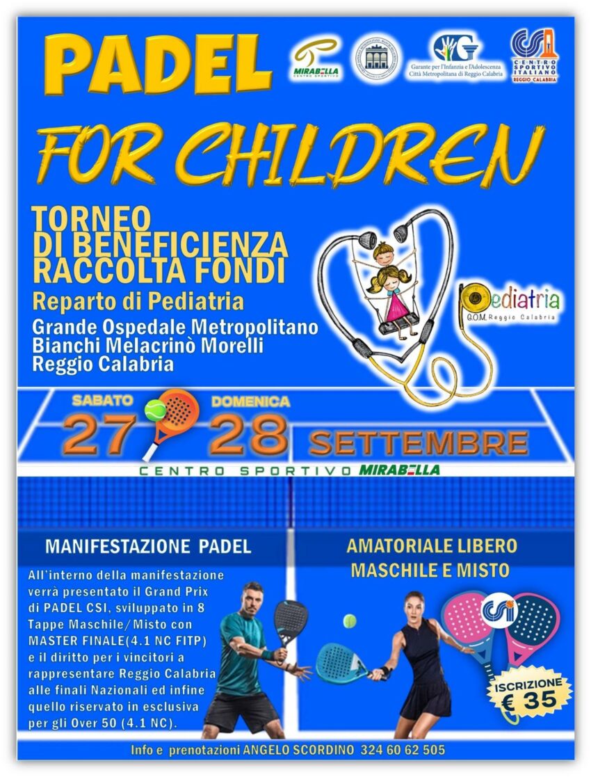 Il Garante per l’Infanzia e l’Adolescenza della Città Metropolitana di Reggio Calabria, Emanuele Mattia, in collaborazione con il Presidente del Comitato Provinciale CSI di Reggio Calabria, Paolo Cicciù, promuove l’iniziativa benefica “Padel for Children”, un torneo amatoriale di padel in programma sabato 27 e domenica 28 settembre presso il Centro Sportivo Mirabella.