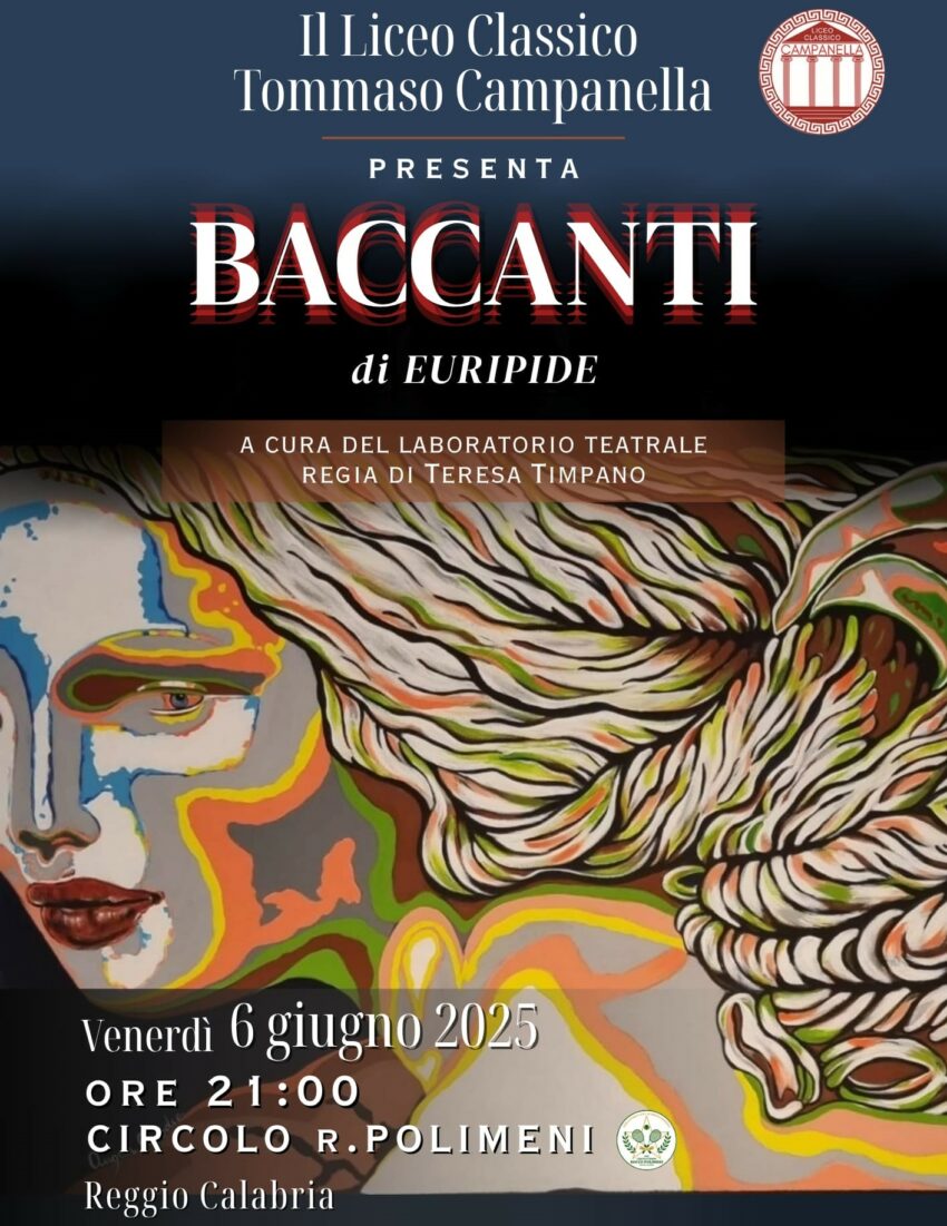 Venerdì 6 giugno alle ore 21:00, nella suggestiva cornice del Circolo “Rocco Polimeni”, si terrà la rappresentazione teatrale “Baccanti” di Euripide a cura del Laboratorio teatrale “Il gioco delle parti” diretto dall’attrice e regista Teresa Timpano. Il laboratorio teatrale, è inserito all’interno dei percorsi co-curriculari finanziati con i fondi del PNRR per una formazione finalizzata ad affrontare le sfide del futuro. E’ quanto si legge nel comunicato stampa. Il testo scelto è una delle opere più complesse e potenti del teatro greco antico. La tragedia fu rappresentata postuma nel 405 a.C. e costituisce un collettore di temi profondi quali: il conflitto tra razionalità e irrazionalità, la concezione del sacro e il rispetto per il divino, l’ambiguità del vero.