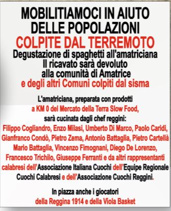 Si svolgerà giovedì 15 settembre 2016 sul Corso Garibaldi, di fronte alla scalinata del Teatro Francesco Cilea, l’iniziativa di solidarietà organizzata dall’Amministrazione Comunale di Reggio Calabria in collaborazione con i rappresentanti reggini della Federazione Italiana Cuochi, l’Associazione Cuochi Reggini e l’Equipe Regionale Cuochi Calabresi. Appuntamento a partire dalle ore 18:00 per una degustazione di spaghetti all’Amatriciana, il cui ricavato sarà devoluto alle popolazioni colpite del sisma dell’Italia centrale cucinata direttamente dai migliori chef calabresi.