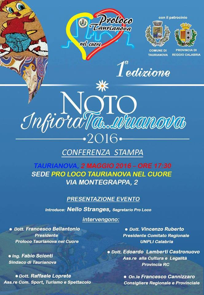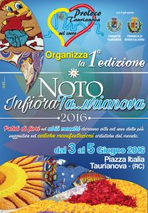 Si terrà lunedì 2 Maggio la conferenza stampa di presentazione della prima edizione de “Noto InfioraTA…URIANOVA”, l’evento artistico-culturale che intratterrà molti visitatori della cittadina pianigiana nel weekend dal 3 al 5 Giugno. Promotrice dell’iniziativa è la Pro Loco “Taurianova nel Cuore”, l’organizzazione no profit che si prefigge di promuovere e valorizzare il territorio taurianovese attraverso una serie di avvenimenti di grande richiamo per la popolazione calabrese, ma in grado anche di valicare i confini regionali.