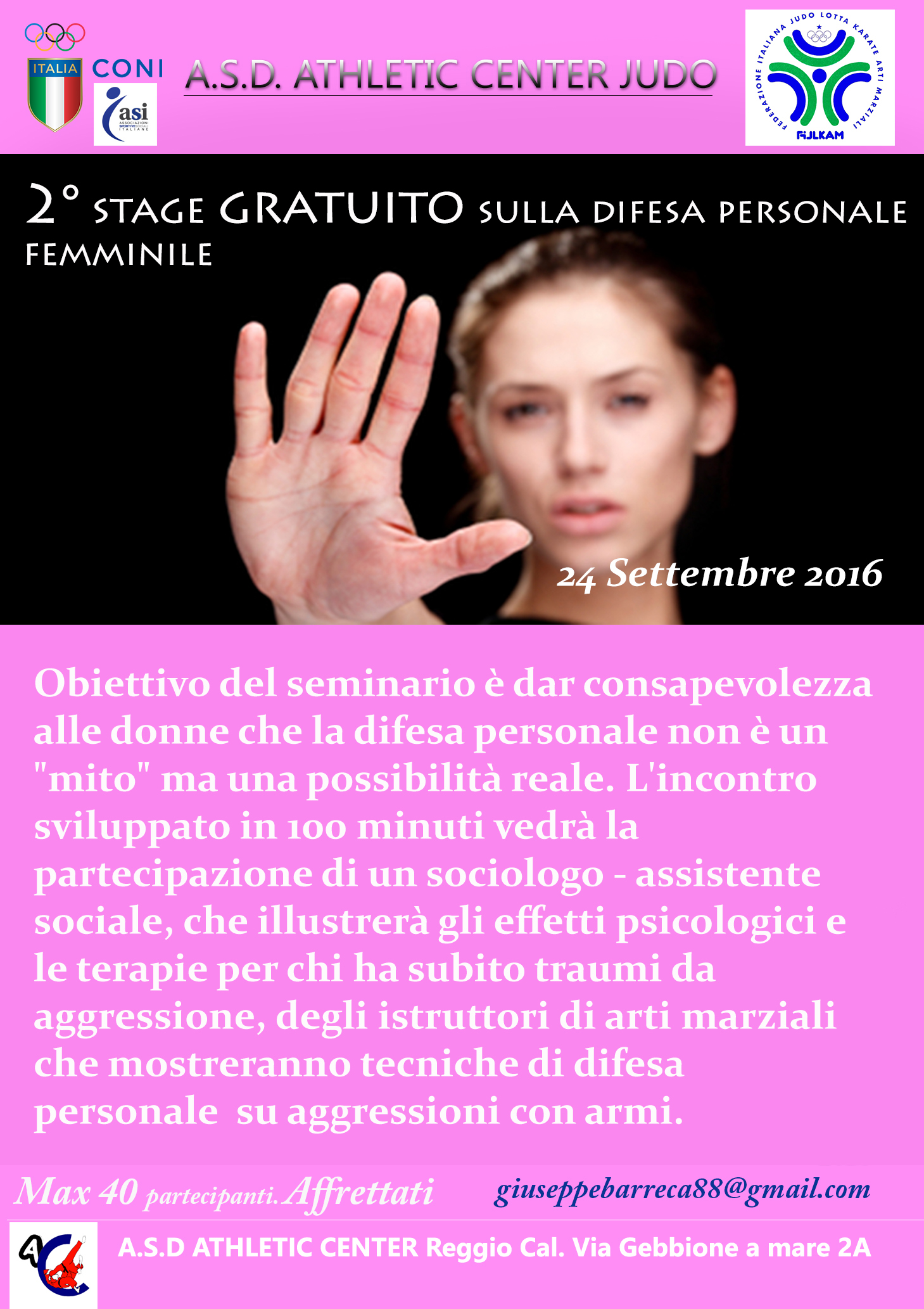 Si svolgerà sabato 24 settembre 2016, presso l’Asd Athletic Center il secondo stage gratuito di difesa personale femminile. L’associazione affiliata al Coni e alla FIJLKAM, per il settore marziale, ripropone questa iniziativa gratuita sul territorio reggino, organizzando vari incontri per l’anno 2017. Il seminario vedrà la partecipazione della dott.ssa