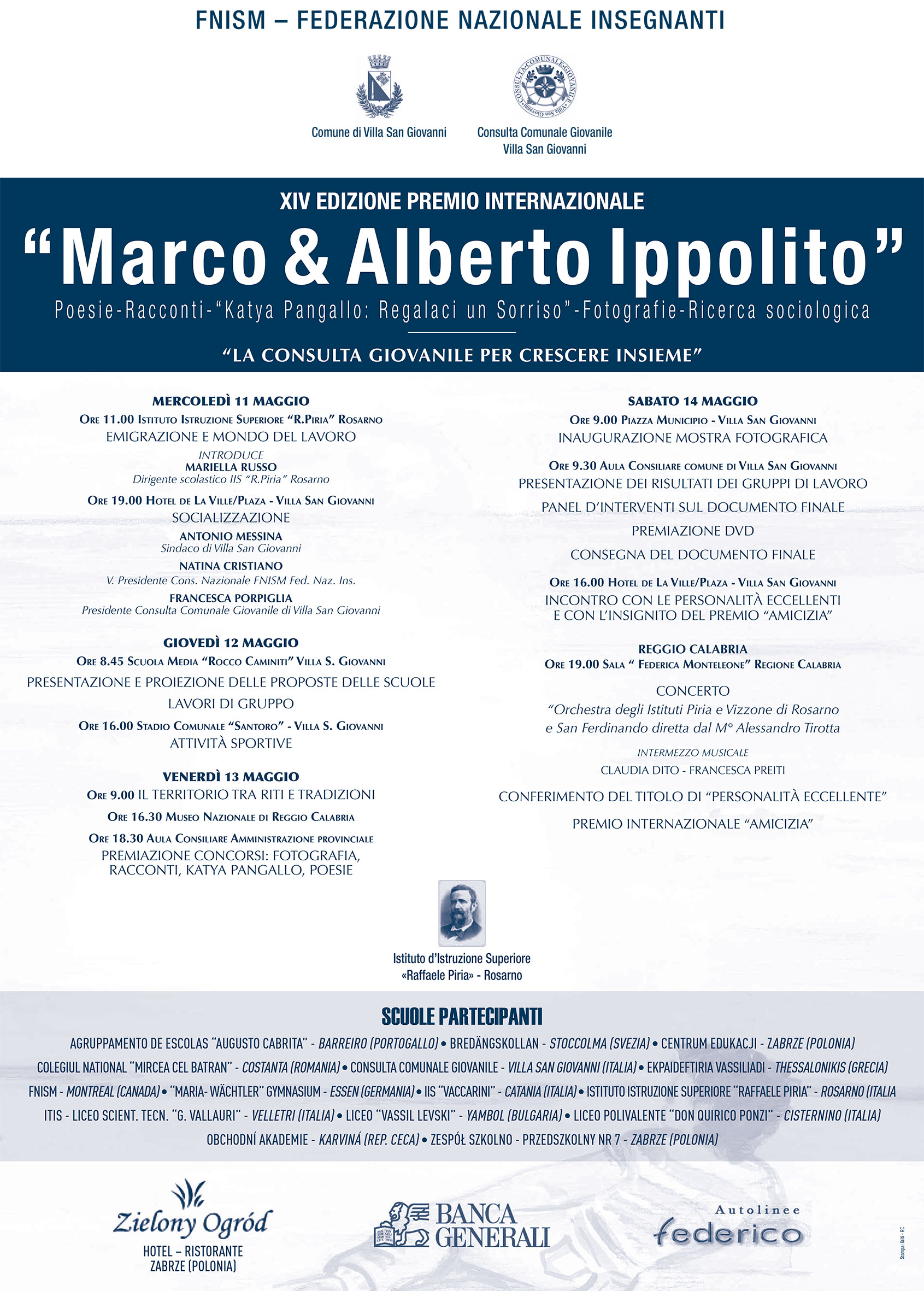 Da Giorno 11 Maggio fino al 14, si svolgerà la XIV edizione del Premio Internazionale Marco & Alberto Ippolito e si troveranno sulle rive dello stretto 13 scuole europee che si confronteranno sul lavoro svolto tutto l’anno in rete.