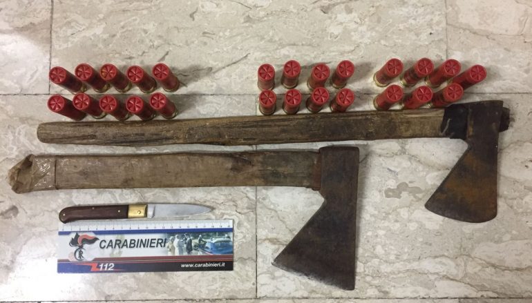 A seguito della perquisizione personale l’uomo è stato trovato in possesso di un coltello a serramanico della lunghezza complessiva di 15 cm., mentre presso la sua abitazione sono state altresì rivenute due asce e 25 cartucce da caccia cal. 12 illegalmente detenute.