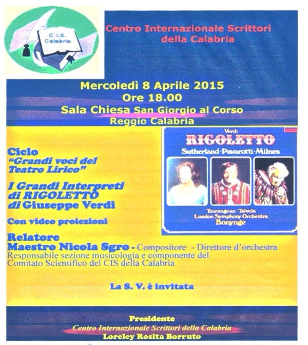 Mercoledì 8 Aprile 2015, alle ore 18.00, presso la sala della Chiesa di San Giorgio al Corso, il Centro Internazionale Scrittori della Calabria, nel contesto del ciclo di incontri con le “Grandi voci del Teatro Lirico”, il Maestro Nicola Sgro, direttore d’orchestra e compositore, dedica il terzoincontro ai Grandi interpreti di Rigoletto di Giuseppe Verdi. Il relatore, attraverso materiale audiovisivo, illustrerà aspetti e tecniche diverse di alcuni dei più grandi interpreti dell’opera di Giuseppe Verdi (Pavarotti, Zeani, Protti, Sutherland, Gruberova, Gobbi). Nicola Sgro, compositore, direttore d’orchestra, responsabile sezione musicologia del Cis della Calabria, ha spaziato con la sua creatività, rivelatasi precocemente, in tutti i generi di composizione musicale: dal teatro lirico all’oratorio, alla musica sinfonica, alle composizioni strumentali da camera, alle liriche per canto e pianoforte. Composizioni di Sgro sono state eseguite da prestigiosi complessi orchestrali (Maggio Musicale Fiorentino, Orchestra da Camera di Catania, Camerata strumentale Casella di Torino, ecc) in concerti trasmessi dalla Rai. Celebri solisti come Severino Gazzelloni, Roberto Fabbriciani, Mario Carbotta, Roberto Cognazzo, Mario delli Ponti, ecc. hanno più volte eseguito con successo musiche strumentali di Nicola Sgro, in Italia ed in vari Paesi europei