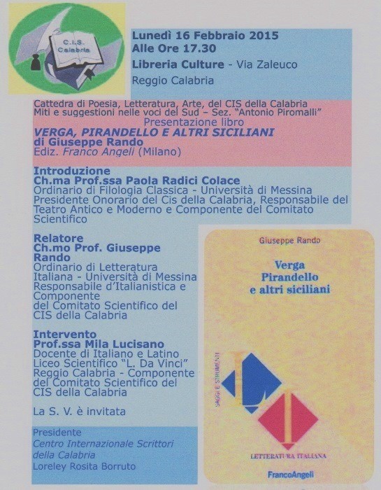 Lunedì 16 Febbraio 2015, alle ore 17.30, nello spazio culturale della Libreria Culture, via Zaleuco, Reggio Calabria, il Centro Internazionale Scrittori della Calabria, per la prima volta nella città dello Stretto, presenterà il libro “Verga, Pirandello e altri siciliani” di Giuseppe Rando, Franco Angeli Editore (Milano).