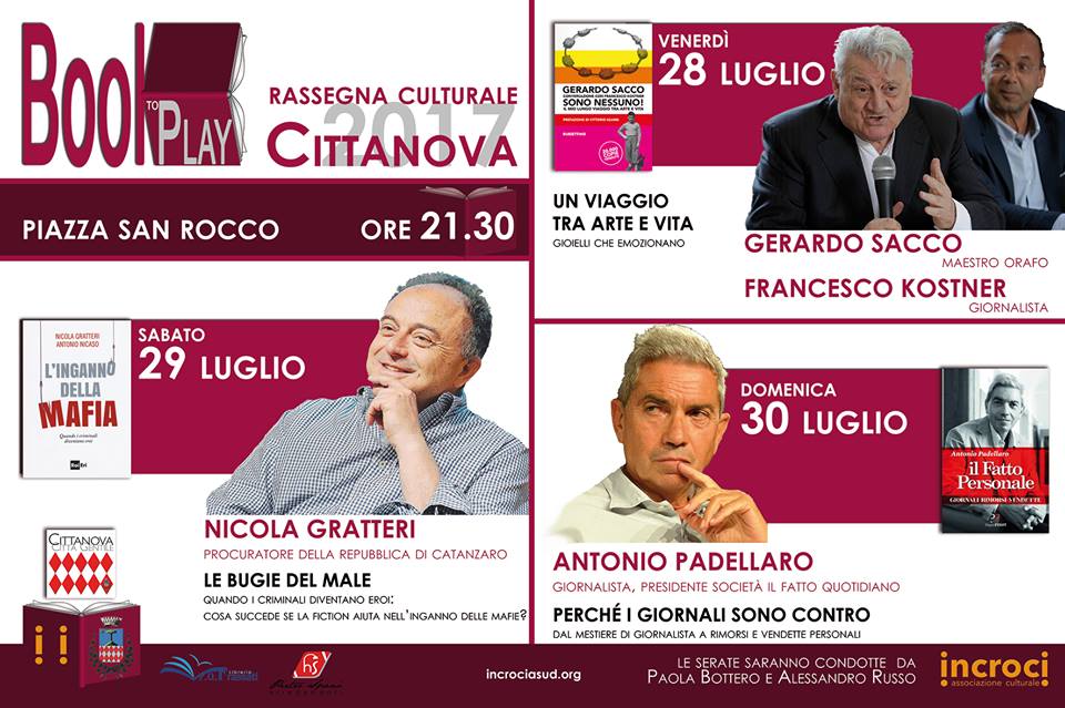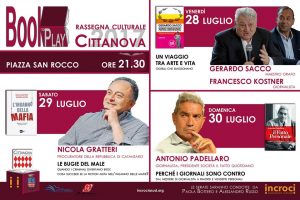 Una delle più belle piazze di Cittanova, piazza San Rocco. Tre libri. Tre serate dell’ultimo fine settimana di luglio. Ed ospiti di rilievo nazionale, che partiranno dal libro di ogni serata per affrontare gli argomenti sociali e di attualità più urgenti e importanti: questo è BOOKtoPLAY. Un evento organizzato dall’associazione culturale Incroci con il Comune di Cittanova: un nuovo modo di intendere i libri, che sono non solo cultura e approfondimento, ma anche intrattenimento e aggregazione.