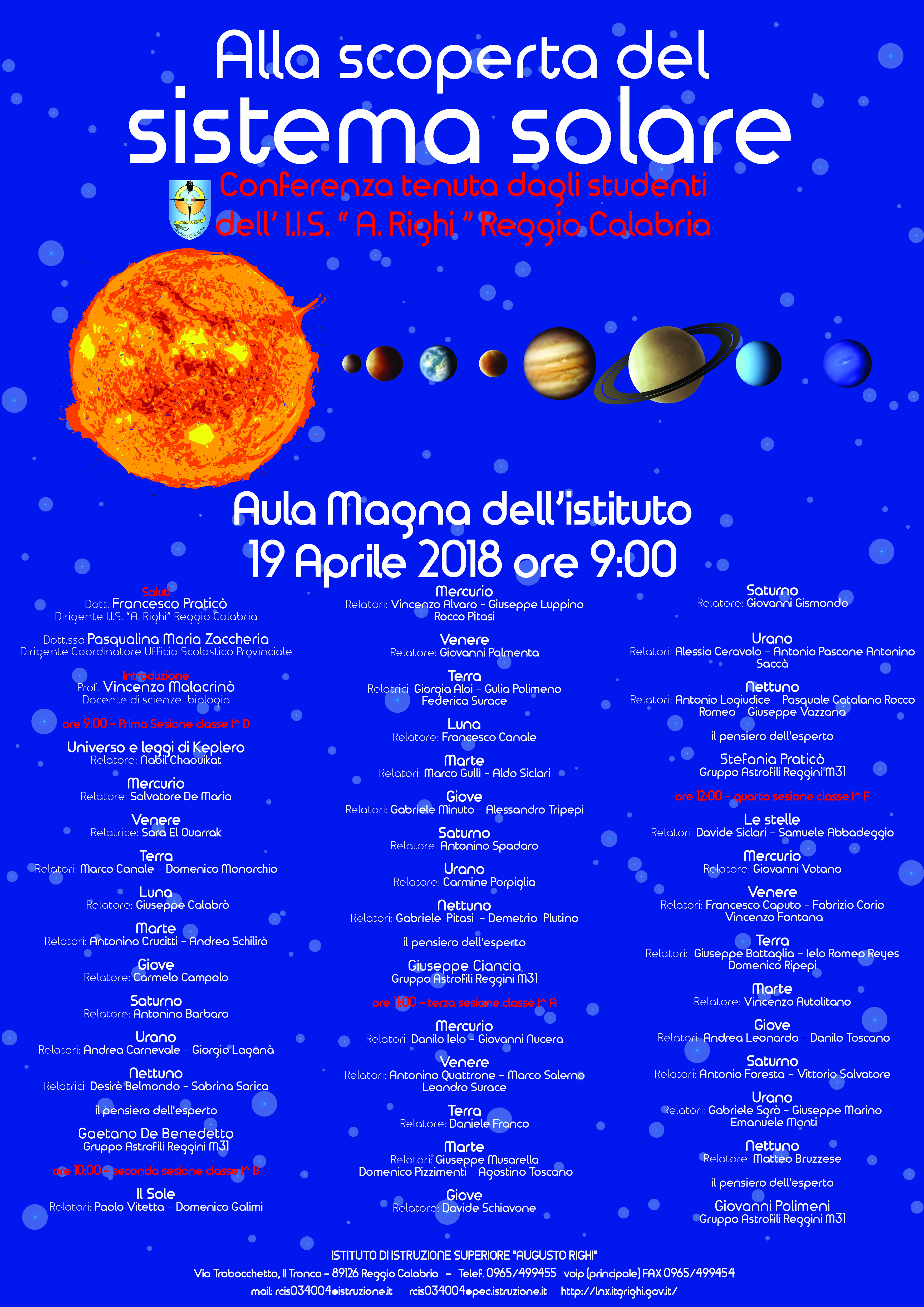 Conferenza Reggio Calabria. Gli alunni delle classi prime dell’Istituto d’Istruzione Superiore “A. Righi” saranno i relatori della conferenza dal titolo “Alla scoperta del sistema solare”.
