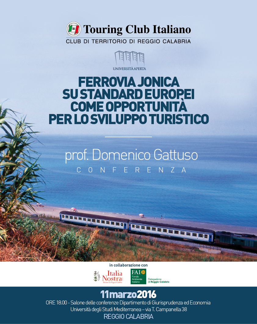 Il giorno 11 marzo 2016, alle ore 18.00, presso il Salone delle conferenze del Dipartimento di Giurisprudenza ed Economia dell’Università degli Studi Mediterranea – via T. Campanella n°38, avrà luogo la conferenza tenuta dal Prof. Domenico Gattuso – docente della Mediterranea – sul tema “Ferrovia jonica su standard europei come opportunità per lo sviluppo turistico”.