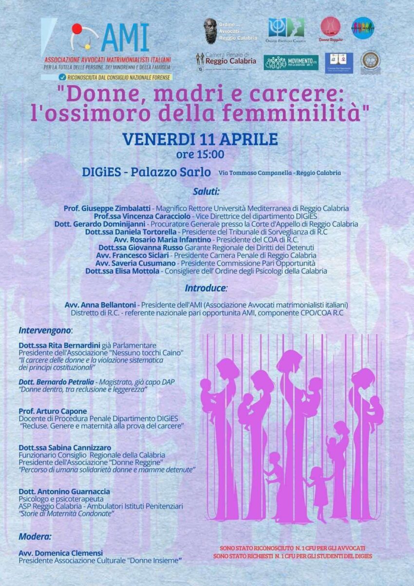 Convegno “Donne, madri e carcere: l’ossimoro della femminilità” a Reggio Calabria organizzato dalla sezione AMI di Reggio Calabria. Domani, 11 Aprile, presso la Sala Conferenze di Palazzo Sarlo di Reggio Calabria, si terrà il convegno organizzato col patrocinio della Camera Penale, del CPO e del Consiglio dell’Ordine degli Avvocati di Reggio Calabria e dell’Università Mediterranea di Reggio Calabria, in collaborazione con l’Ordine Psicologi Calabria e le Associazioni “Donne Reggine”, “Donne Insieme”.