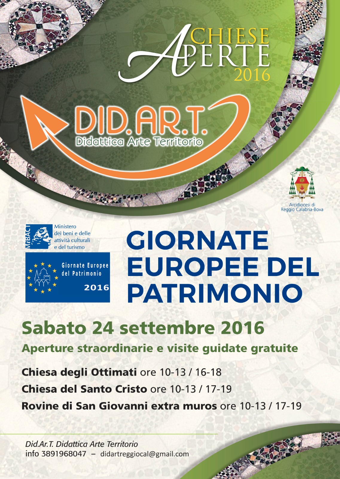 A Reggio Calabria ai luoghi della cultura statali che aderiscono alle Giornate si aggiungono i volontari dell’Associazione Did.Ar.T. cui è stata affidata nei mesi estivi, nell’ambito del Progetto Chiese aperte, apertura, custodia e valorizzazione di alcune importanti chiese del centro storico cittadino e delle sue immediate adiacenze.