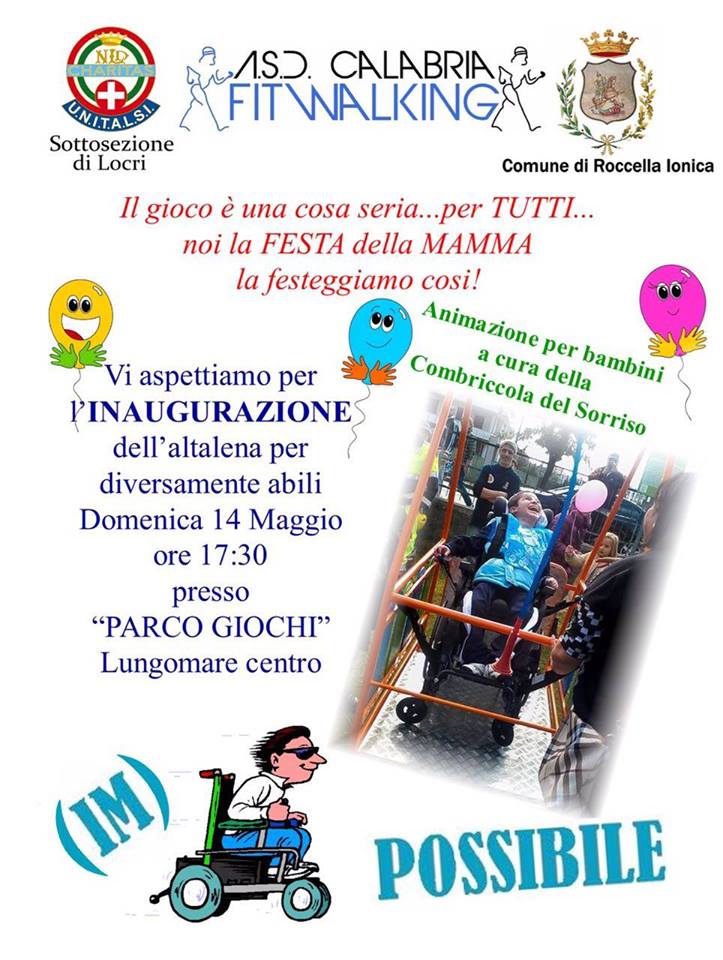 Una sola giornata ma densa di emozioni, domani 14 maggio, la giornata dedicata a tutte le mamme; partirà da Piazza dei Martiri la camminata cittadina che attraverserà la città festeggiando la giornata più bella dell’anno, quella dedicata a tutte le Mamme. Continuerà nel pomeriggio l’impegno con l’inaugurazione dell’altalena per bambini diversamente abili che verrà inaugurata presso il parco giochi Lungomare Centro a Roccella Jonica. Quest’ultima proveniente dai contributi dei camminatori che hanno partecipato alle manifestazioni dell’ASD Calabria Fitwalking.