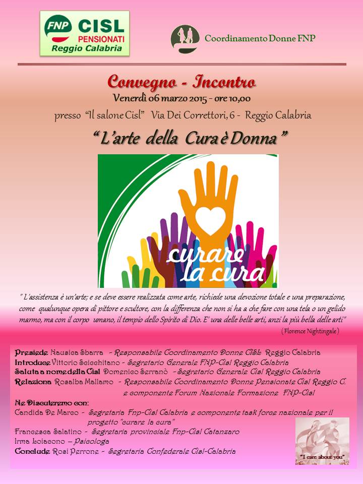 F.N.P.-CISL e Coordinamento Donne FNP-CISL hanno organizzato per venerdì, ore 10,00, presso il salone in via dei Correttori il convegno “l’arte della cura è donna”. (alleghiamo locandina con scaletta).
