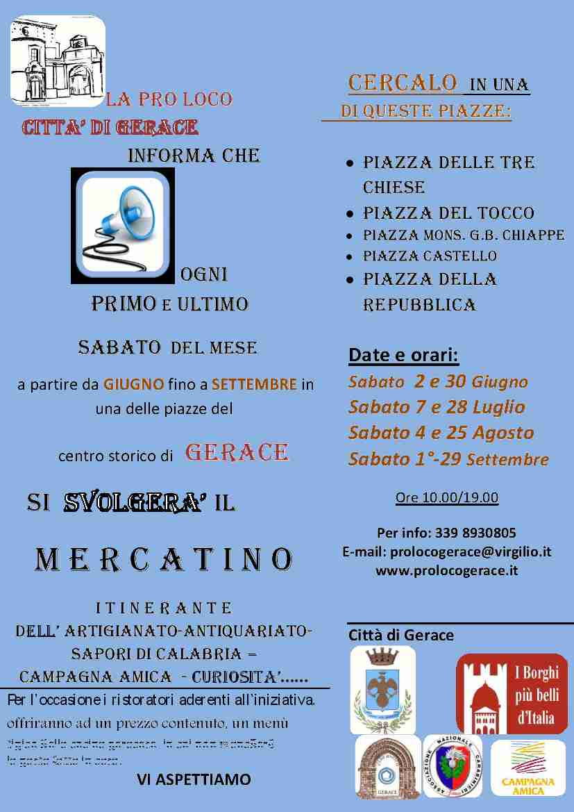 LA Pro Loco Città di Gerace invita i cittadini a partecipare al “MERCATINO DEL SABATO” – Artigianato – Antiquariato – Prodotti Tipici -Campagna Amica- Curiosità…..