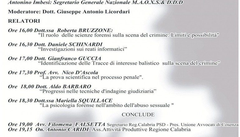 Al convegno, moderato dal Dott. Giuseppe Antonio Licordari (Responsabile del Dipartimento di Medicina Legale del M.A.O.X.S.& D.D.D) dopo l’introduzione del Segretario Generale Nazionale del M.A.O.X.S.& D.D.D Antonello Imbesi, relazioneranno la criminologa Roberta Bruzzone (Presidente Onorario del M.A.O.X.S.& D.D.D), il Dott. Daniele Schinardi (Presidente del M.A.O.X.S.& D.D.D) il Dott. Gianfranco Guccia (Responsabile del Dipartimento D.I.S.del M.A.O.X.S.& D.D.D), l’Avv. Nico D’Ascola (Docente di Diritto Penale presso la facoltà di Giurisprudenza di Reggio Calabria) il Dott. Aldo Barbaro (Specialista in Medicina Legale e delle Assicurazioni) e la Dott.ssa Mariella Squillace (Responsabile Dipartimento Violenza e Maltrattamento Minori del M.A.O.X.S.& D.D.D).