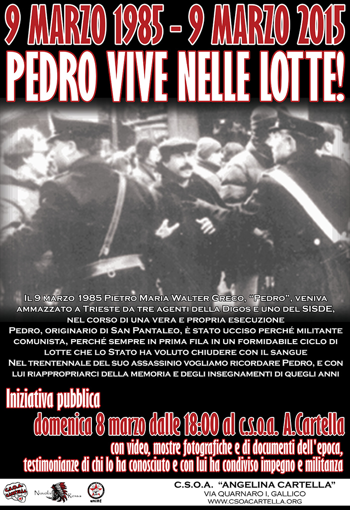 Il 9 marzo 1985 Pietro Maria Walter Greco, “Pedro”, veniva ammazzato a Trieste da tre agenti della Digos e uno del SISDE, nel corso di una vera e propria esecuzione.