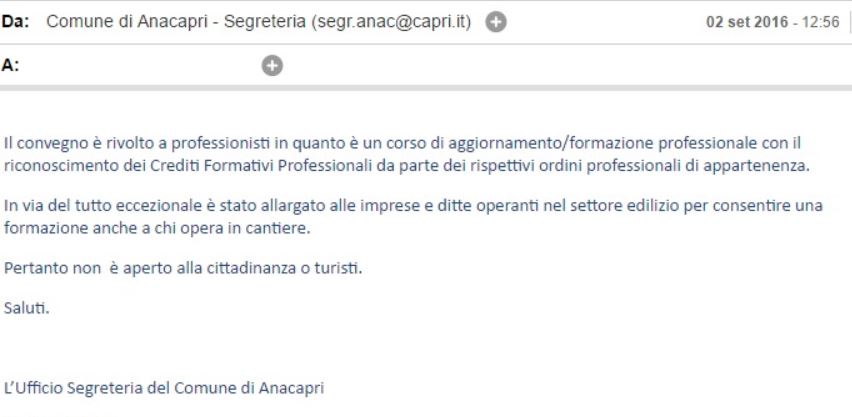 Preciso di essere una ragazza della locride e a breve partirò per una vacanza sull’isola di Capri. In previsione di ciò, visitando alcuni siti, ho visto una locandina la quale annuncia un convegno che tratterà di accessibilità, proprio nei giorni in cui io mi trovo li. Essendo io una ragazza disabile, avevo deciso di partecipare a questo evento che sembrava alquanto interessante se non che, dopo aver inviato un e-mail alla segreteria del comune di Anacapri chiedendo di potervi accedere, mi è stato risposto che è rivolto soltanto a professionisti, allargato anche alle imprese e ditte operanti nel settore edilizio e dunque non aperto alla cittadinanza e ai turisti.